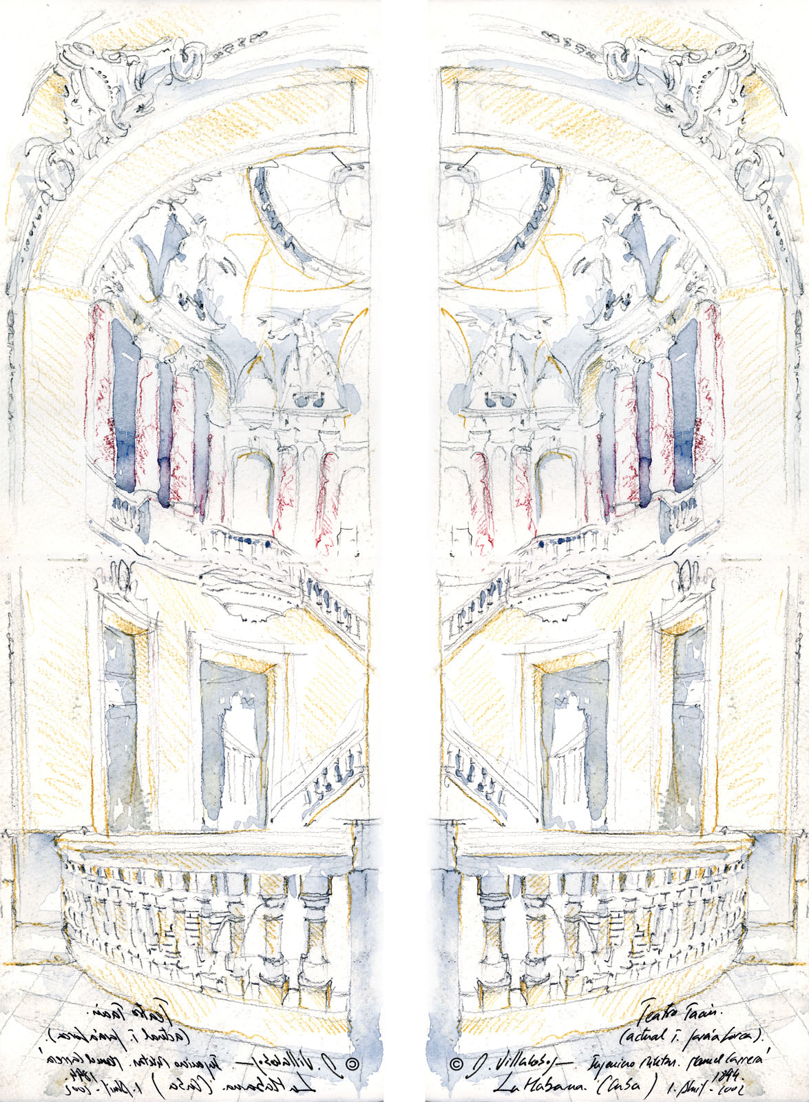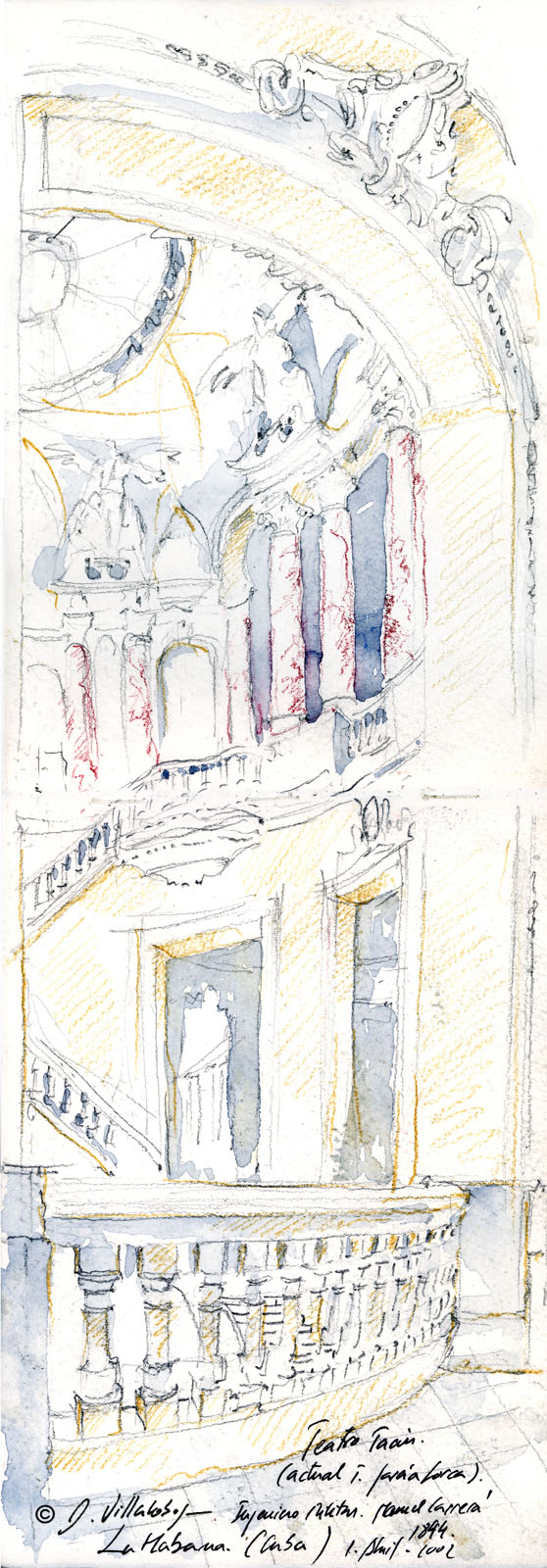 CUBAGRAN TEATRO DE LA HABANA “TEATRO TACÓN”. ARQ. ANTONIO MAYO (1838). LA HABANA, CUBA (HAVANA, CUBA). [Descripción: “Teatro Tacón (actual T. García Lorca). Ingeniero Militar Manuel Carrerá 1844. La Habana. (Cuba). 1-Abril-2002.” Lápices de colores y acuarela [50 x 17,5 cts.] (Dibujo realizado para ser contemplado junto a su reflejo en un espejo). © Daniel Villalobos Alonso]