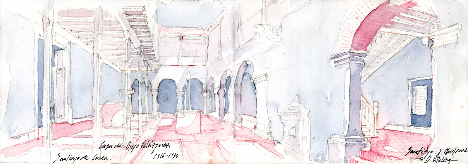 CUBACASA DEL POETA JOSÉ MARÍA HEREDIA Y HEREDIA (CASA COLONIAL S. XVIII). SANTIAGO DE CUBA. [Descripción: “Casa del poeta José Mª de Heredia. Casa Colonial s. XVIII. (Detrás del acceso a la estancia principal). Santiago de Cuba. Santiago. 2-Abril-2002.” Lápices de colores y acuarela [50 x 17,5 cts.]. © Daniel Villalobos Alonso]