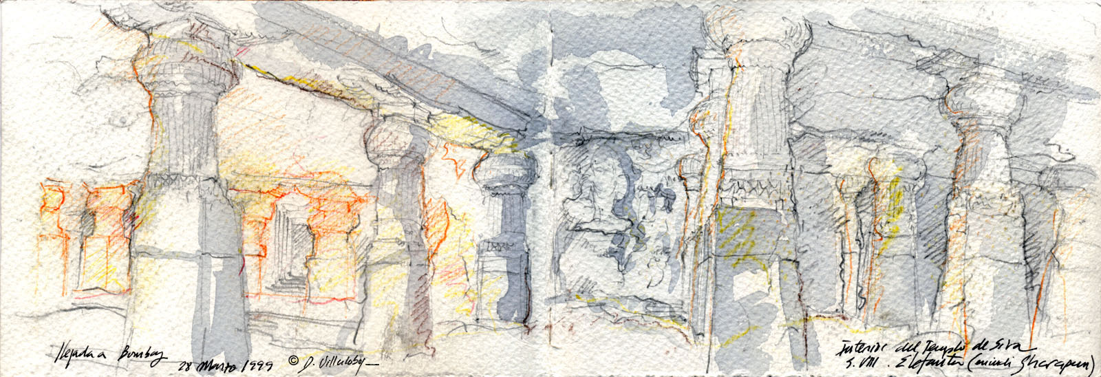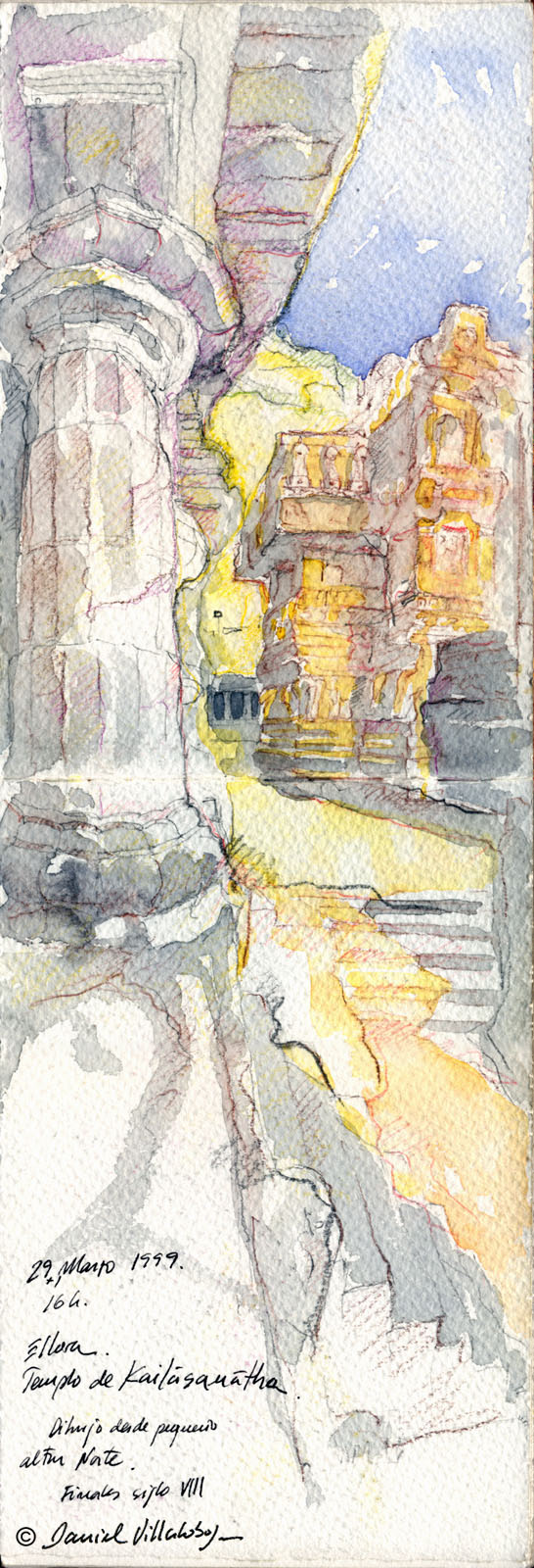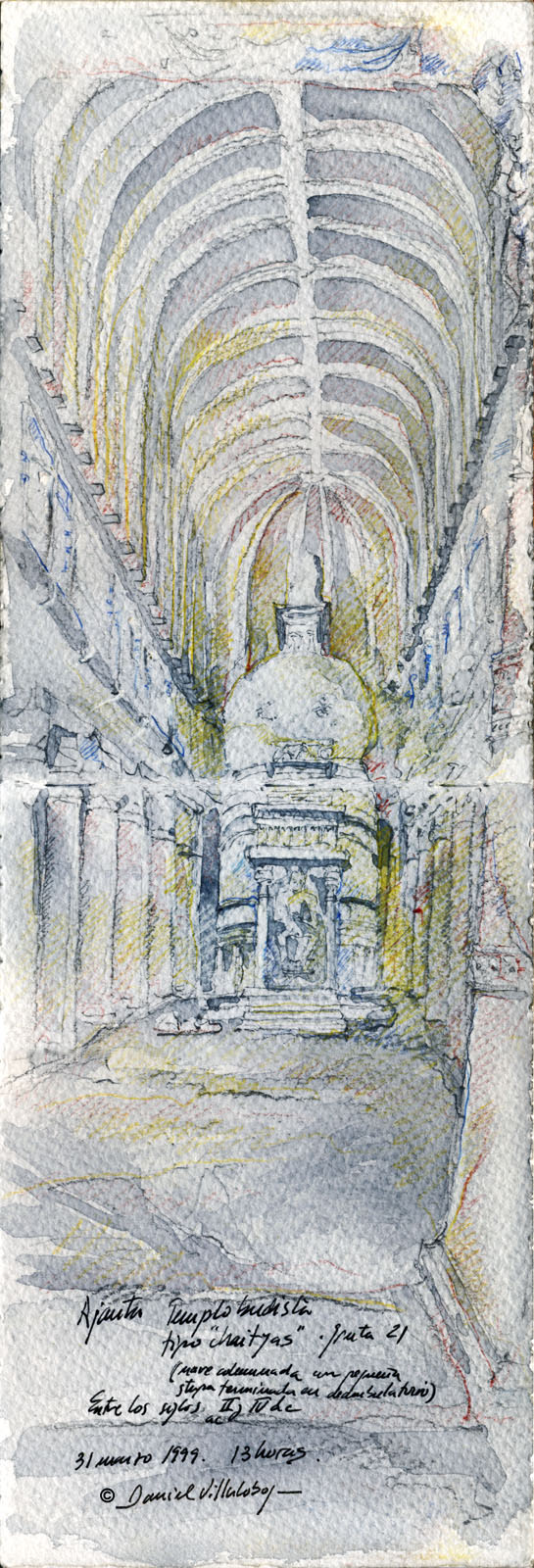 INDIATEMPLO DE AJANTĀ Nº 21. AJANTĀ, AURANGABAD. INDIA. [Descripción: “Ajanta. Templo budista tipo “chaityas”. Gruta 21 (nave columnada con pequeña stupa terminada en deambulatorio). Entre los siglos II a.C. y IV d.C. 31 marzo 1999.” 13 horas. Lápices de colores y acuarela [50 x 17,5 cts.]. © Daniel Villalobos Alonso]