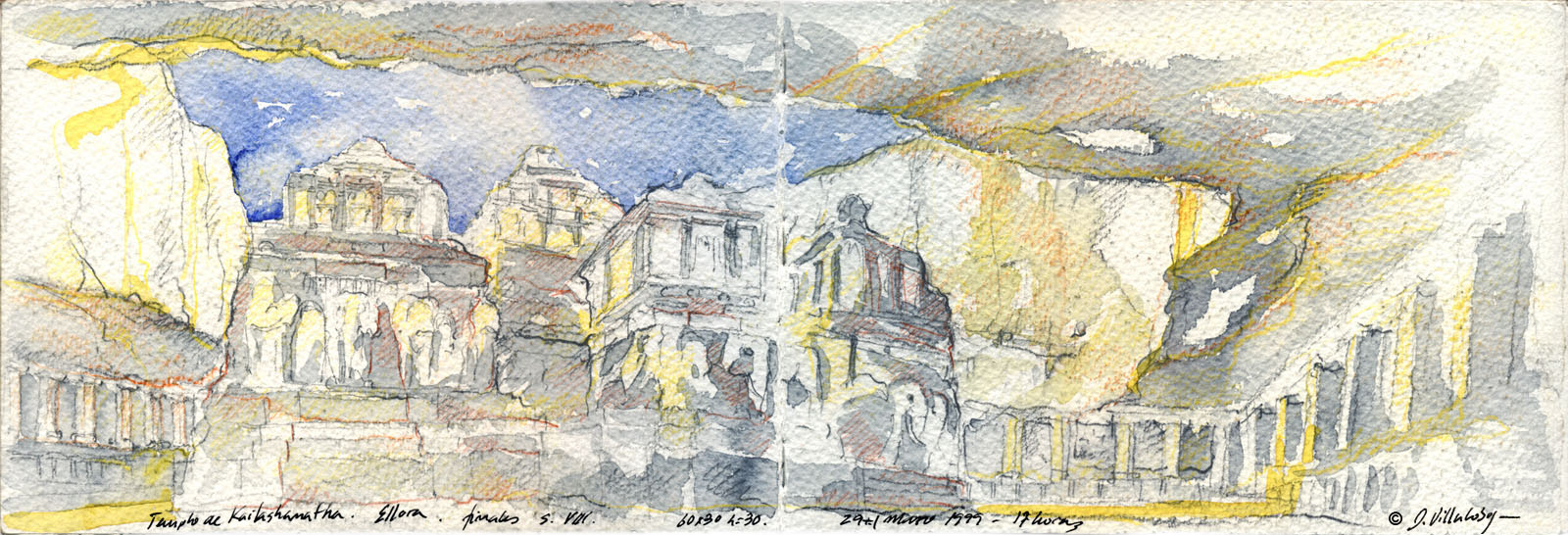 INDIATEMPLO BUDISTA DE AJANTĀ Nº 7-8. AJANTĀ, AURANGABAD. INDIA. [Descripción: “Ajanta. Gruta templo budista nº 7-8, al fondo templos 18 a 22. s. VII? (Tipo “Chaityas”). (Sala cuadrada hipóstila). 31 Marzo de 1999. 14 horas.” Lápices de colores y acuarela [17,5 x 50 cts.]. © Daniel Villalobos Alonso]
