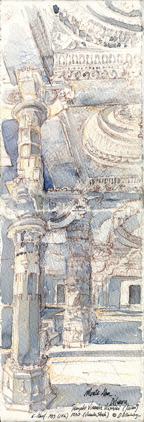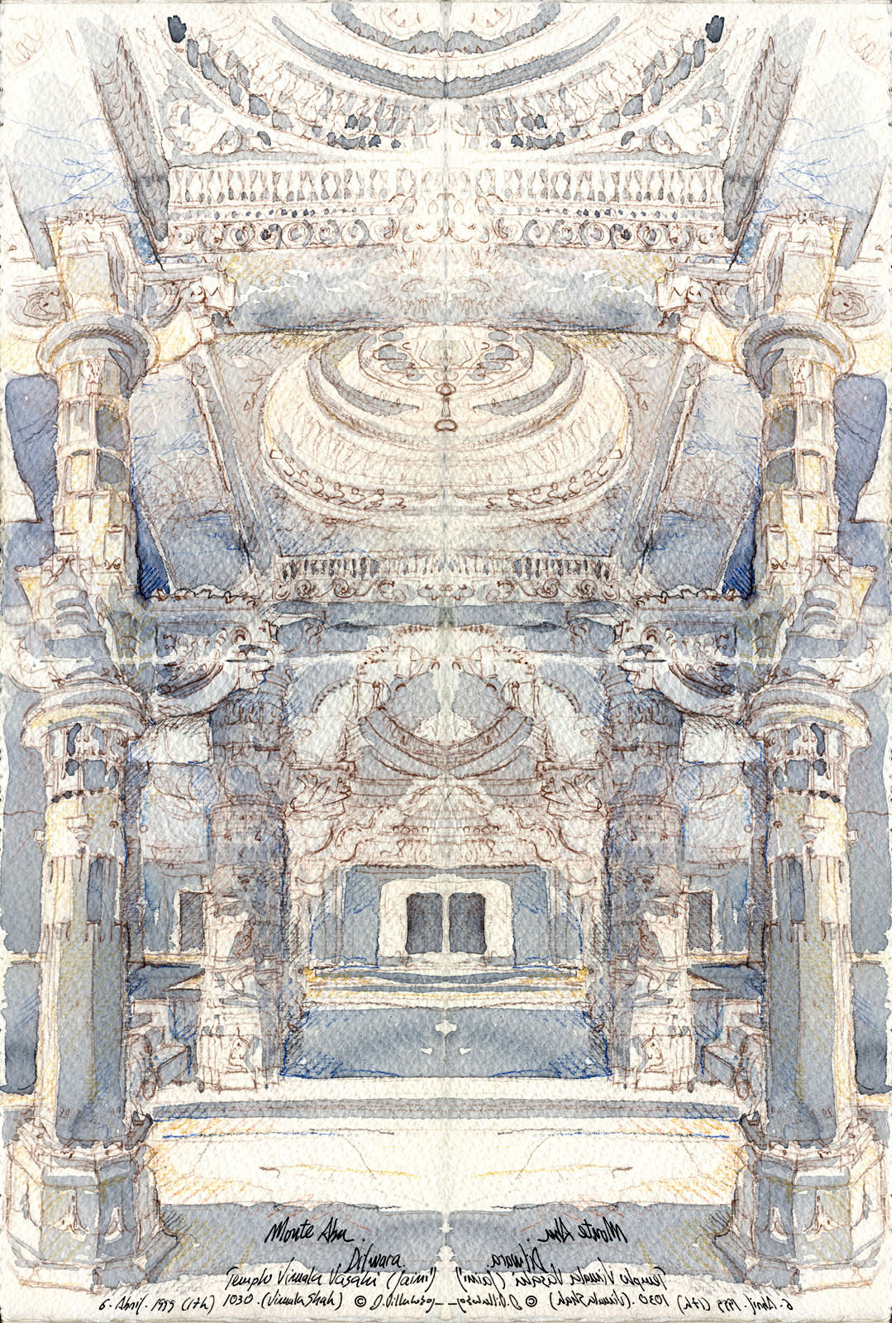 INDIAMONASTERIO DE DILWARA. MONTE ĀBŪ, RAJASTÁN. INDIA. [Descripción: “Monte Abu. Dilwara. Templo Vimala Vasahi (Jainí). 1030. (Vimala Shah). 6-Abril-1999 (17 h.).” Lápices de colores y acuarela [50 x 17,5 cts.] (Dibujo realizado para ser contemplado junto a su reflejo en un espejo). © Daniel Villalobos Alonso]