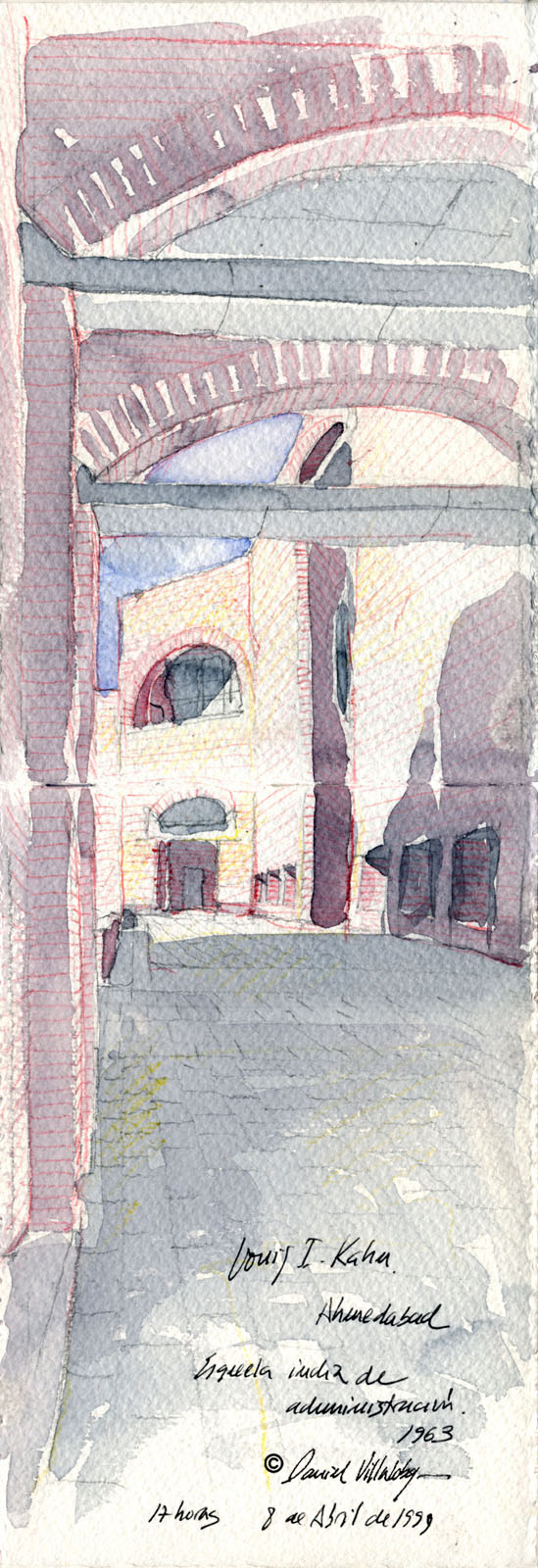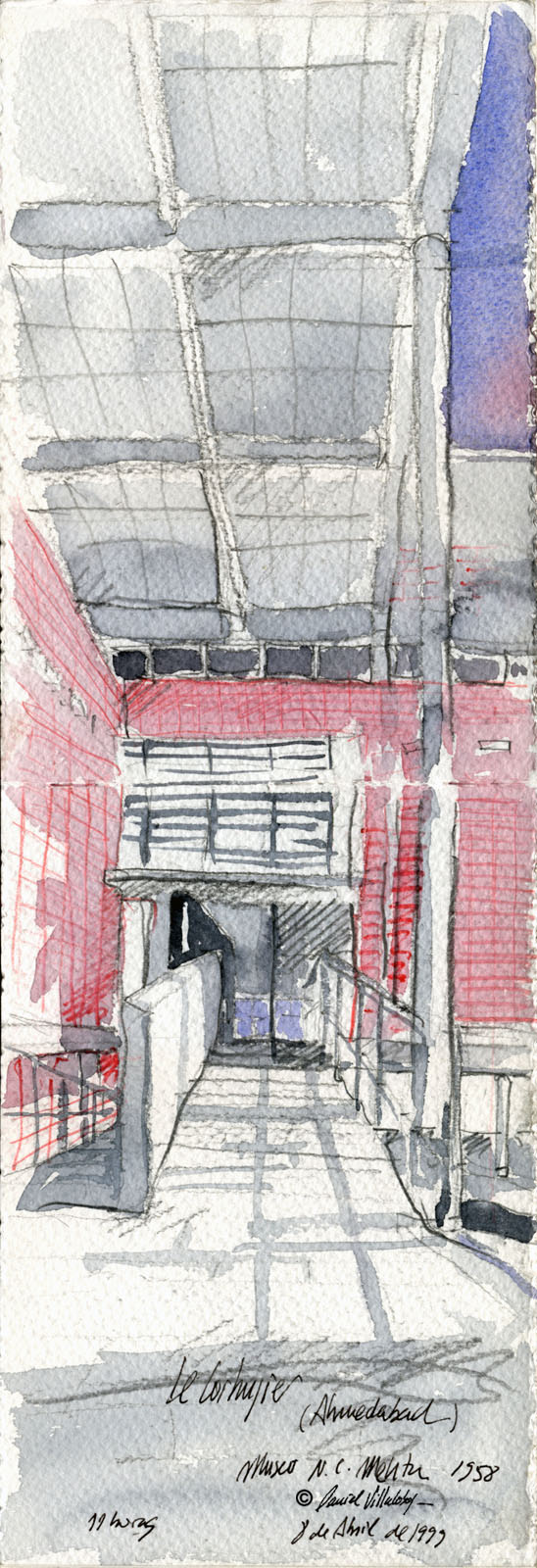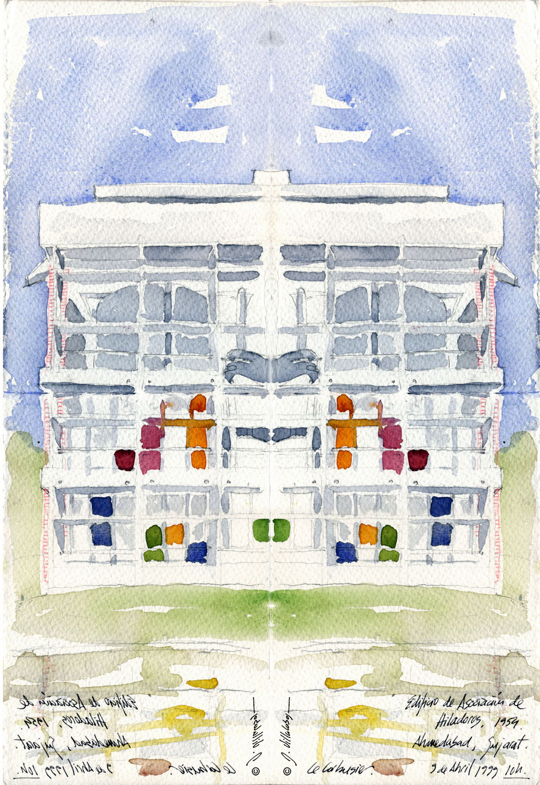 INDIAPALACIO DE LA ASOCIACIÓN DE HILADORES. ARQ. LE CORBUSIER (1954). AHMEDABAD. INDIA. [Descripción: “Le Corbusier. Edificio de Asociación de Hiladores. 1954. Ahmedabad, Gujarat. 9 de Abril 1999. 10h.” Lápices de colores y acuarela [50 x 17,5 cts.] (Dibujo realizado para ser contemplado junto a su reflejo en un espejo). © Daniel Villalobos Alonso]