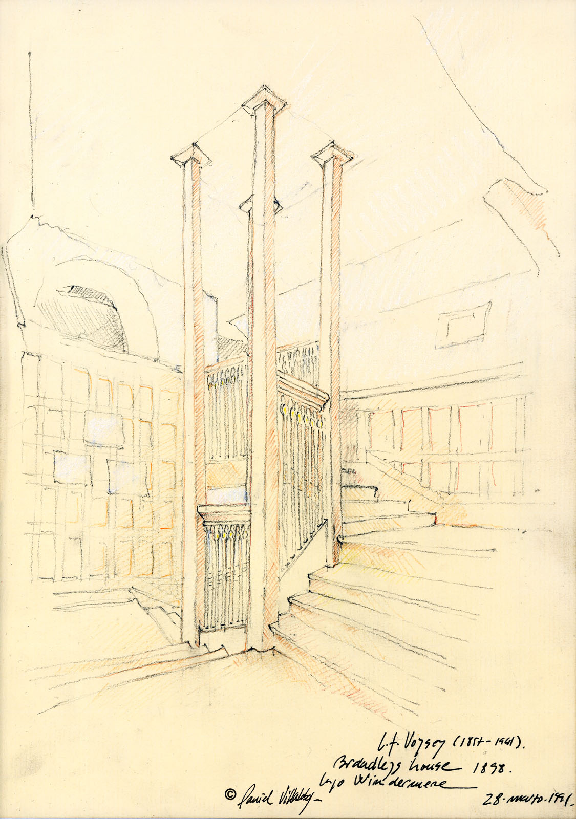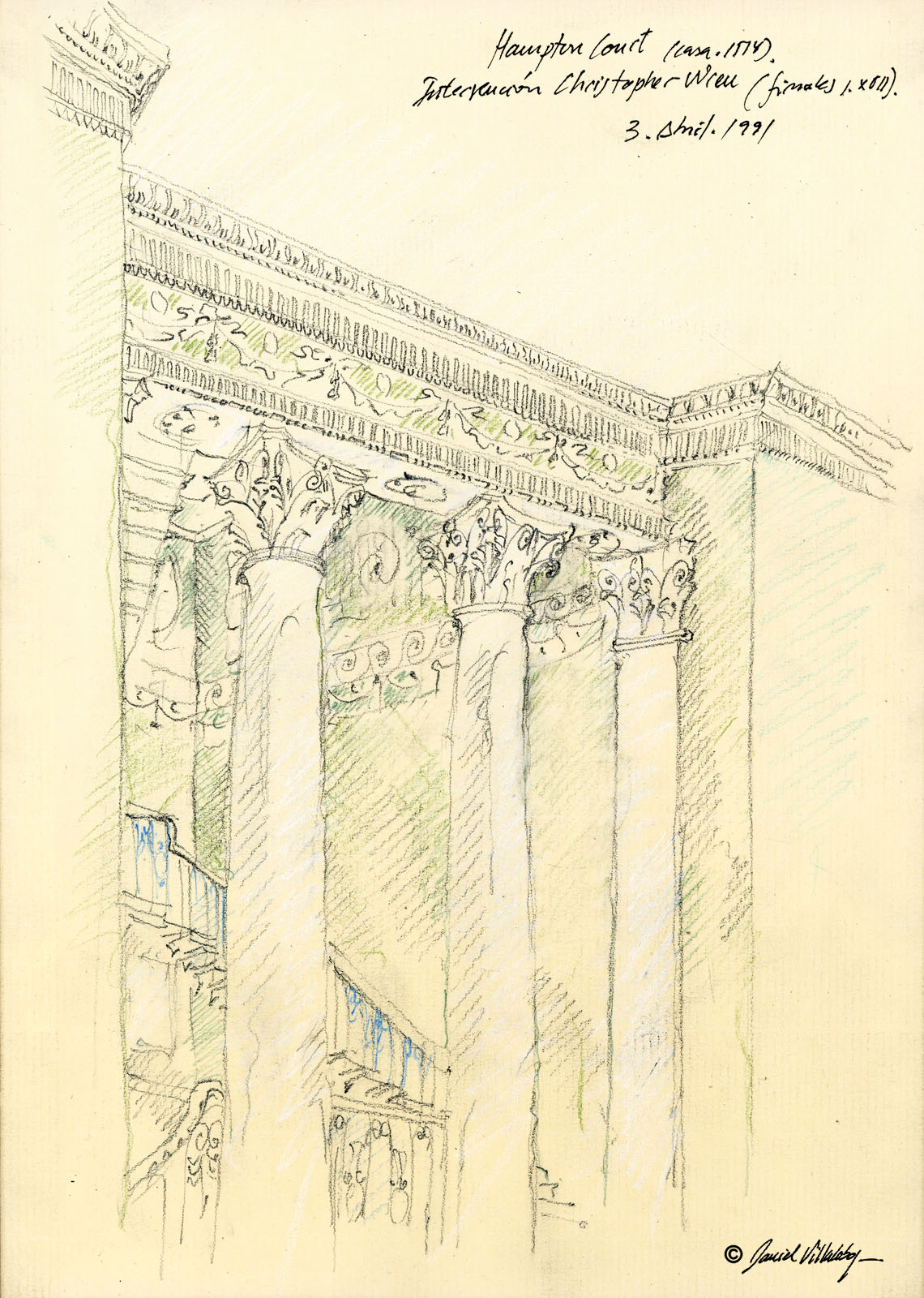 INGLATERRA PALACIO DE HAMPTON COURT (1514−). ARQ. CHRISTOPHER WREN (FINALES S. XVII). RICHMOND UPON THAMES. LONDRES, INGLATERRA (ENGLAND). [Descripción: “Hampton Court (casa.1514). Intervención Christopher Wren (finales s. XVII). 3-abril-1991.” Lápices de colores [29,7 x 21 cts.]. © Daniel Villalobos Alonso]
