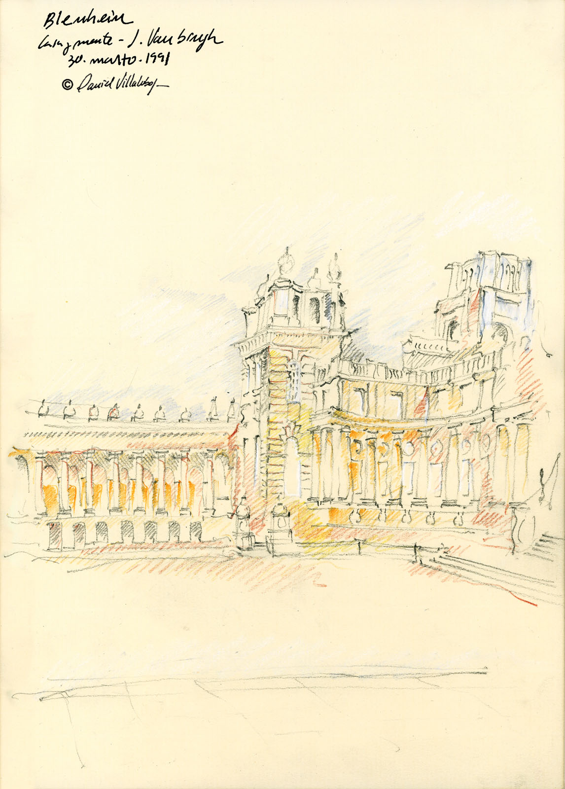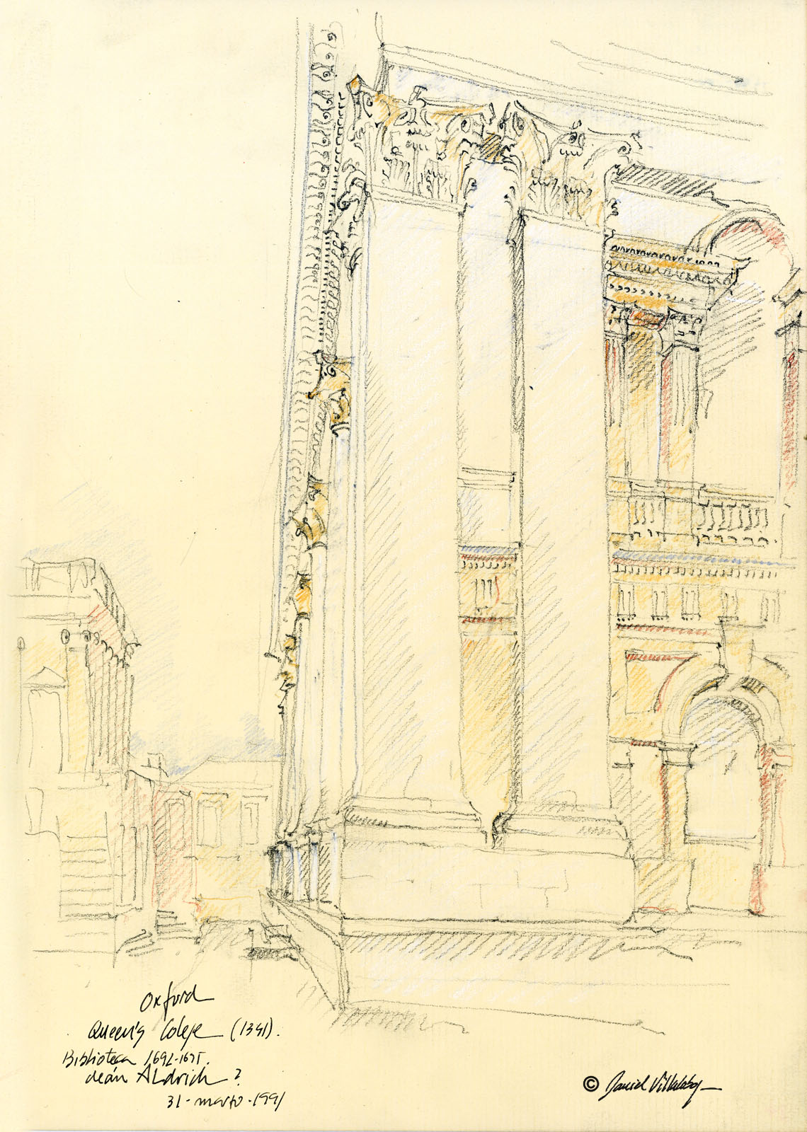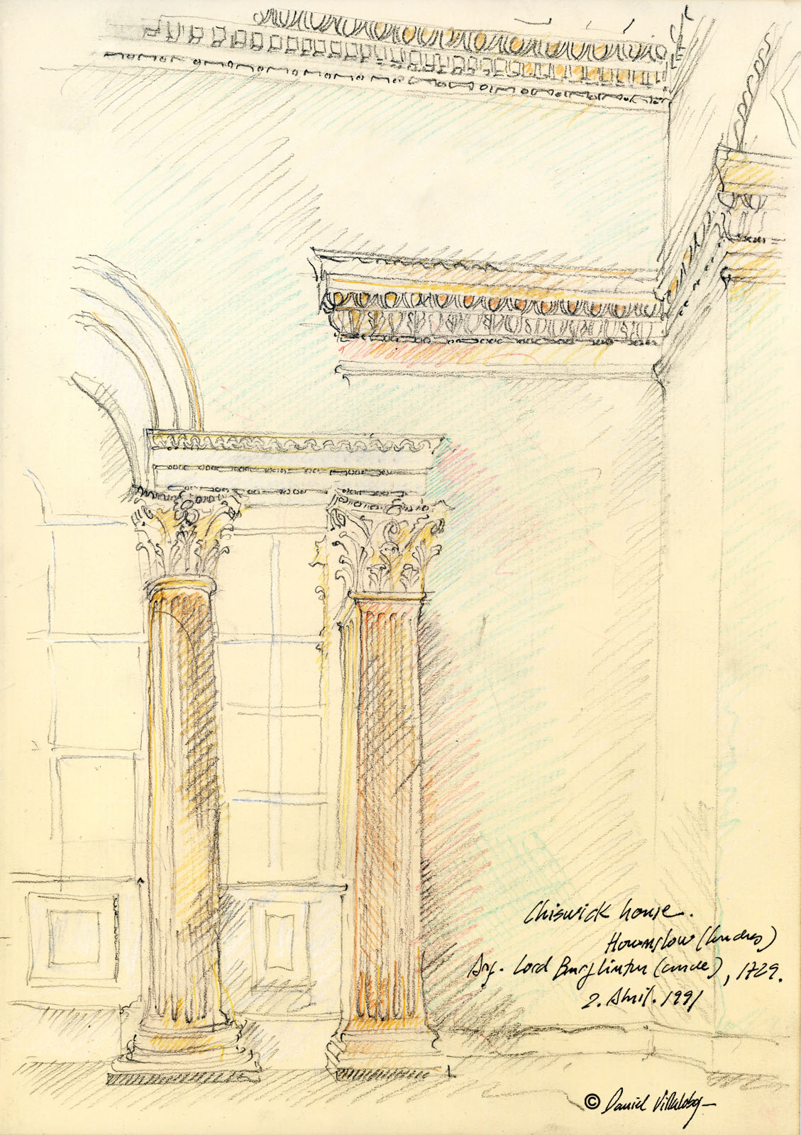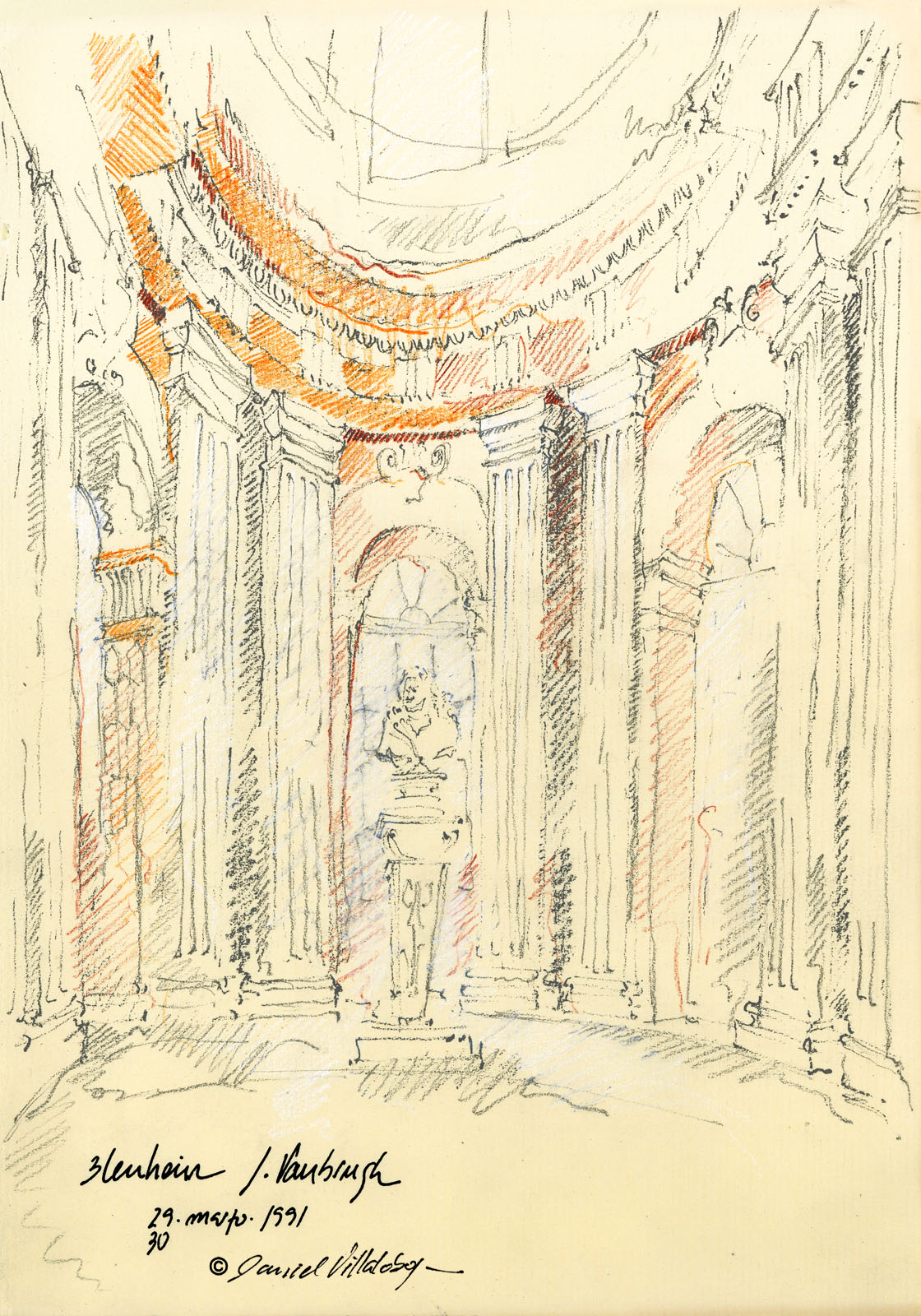 INGLATERRA BOWOOD HOUSE. ARQ. ROBERT ADAM (ALA DE DIOCLECIANO, Y OTROS INTERIORES. 1770). WILTSHIRE (CERCA DE CALNE). INGLATERRA (ENGLAND). [Descripción: “Bowood House. Robert Adam (bibli. y mausoleo) 1.768. Entrada a la capilla (1824). 26-marzo-1991.” Lápices de colores [29,7 x 21 cts.]. © Daniel Villalobos Alonso]