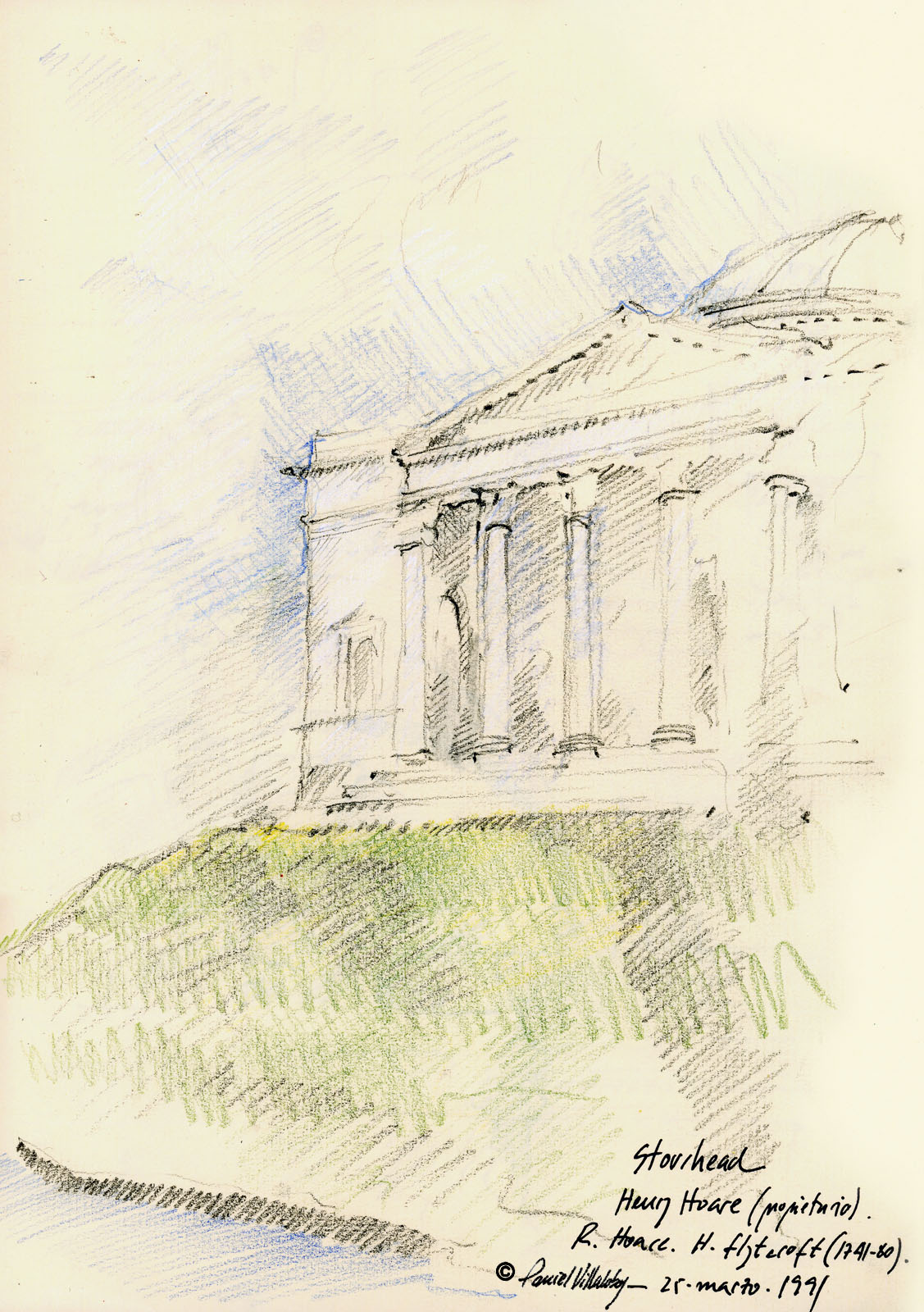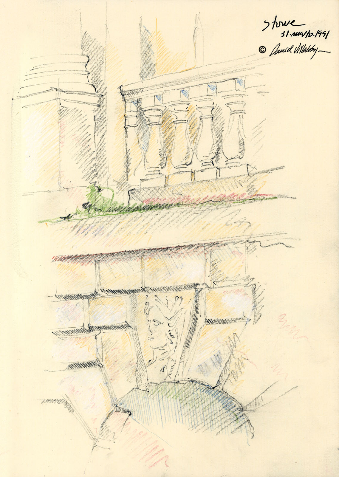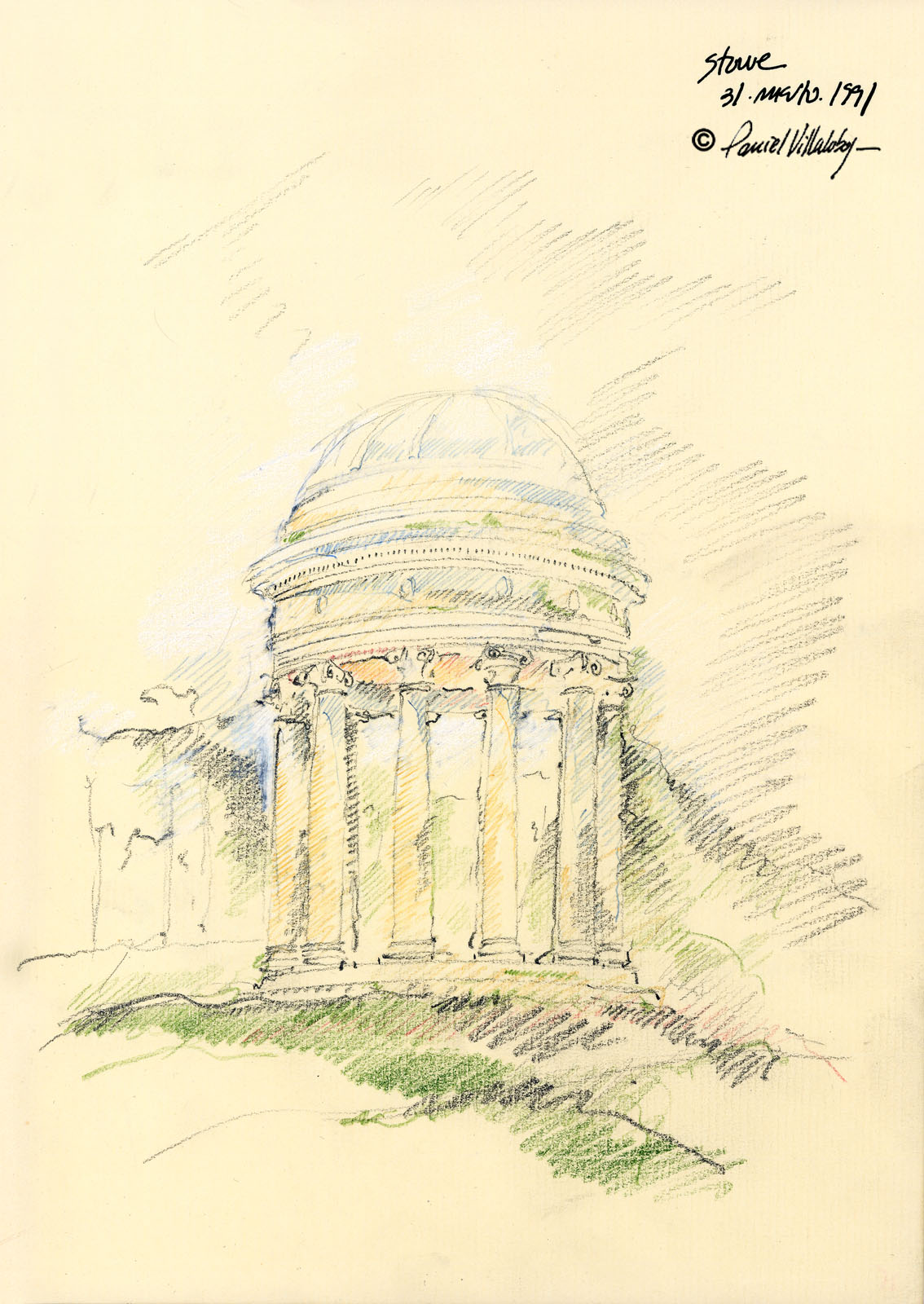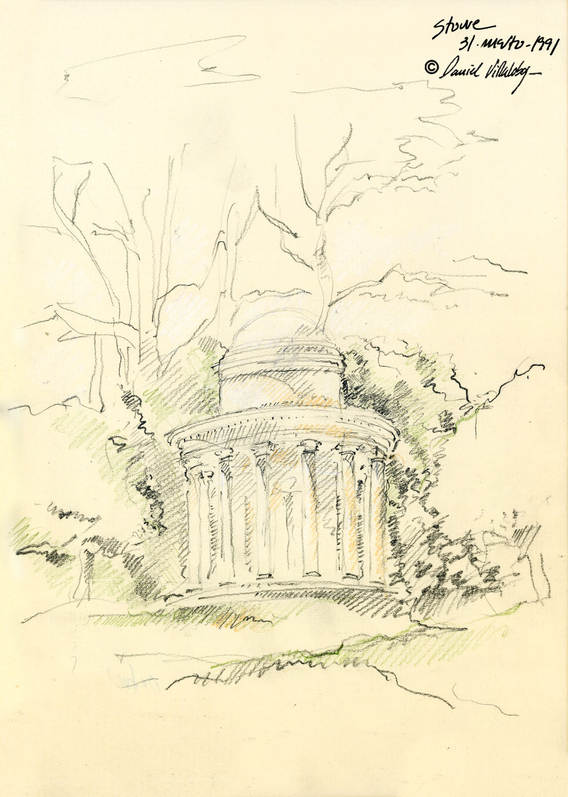 INGLATERRAJARDINES DE STOWE. ARQS. CHARLES BRIEDGMAN Y JOHN VANBRUGH (1713-1738). WILLIAM KENT (1738-1748). LANCELOT “CAPABILITY” BROWN (1748). BUCKINGHAMSHIRE, INGLATERRA (ENGLAND). [Descripción: “Stowe. 1713-38 Ch. Briedgman / John Vanbrugh. W. Kent (1738-48) / L. Brown (1748). 31-marzo-1991.” Lápices de colores [29,7 x 21 cts.]. © Daniel Villalobos Alonso]
