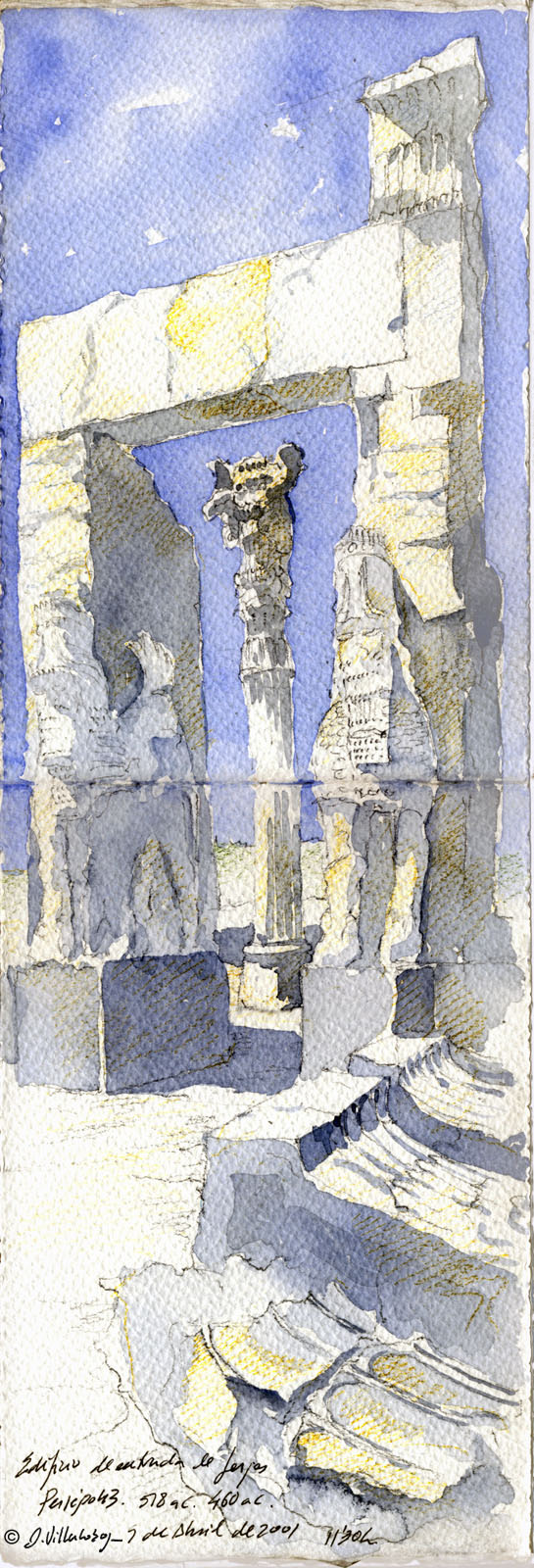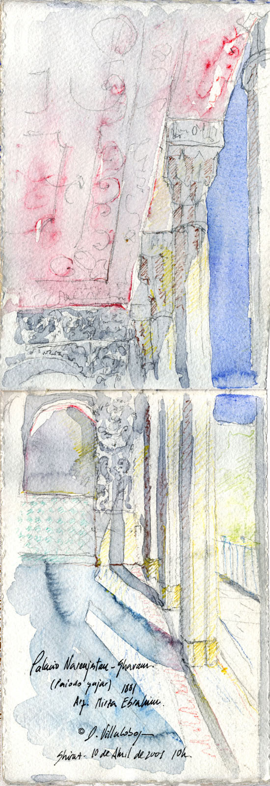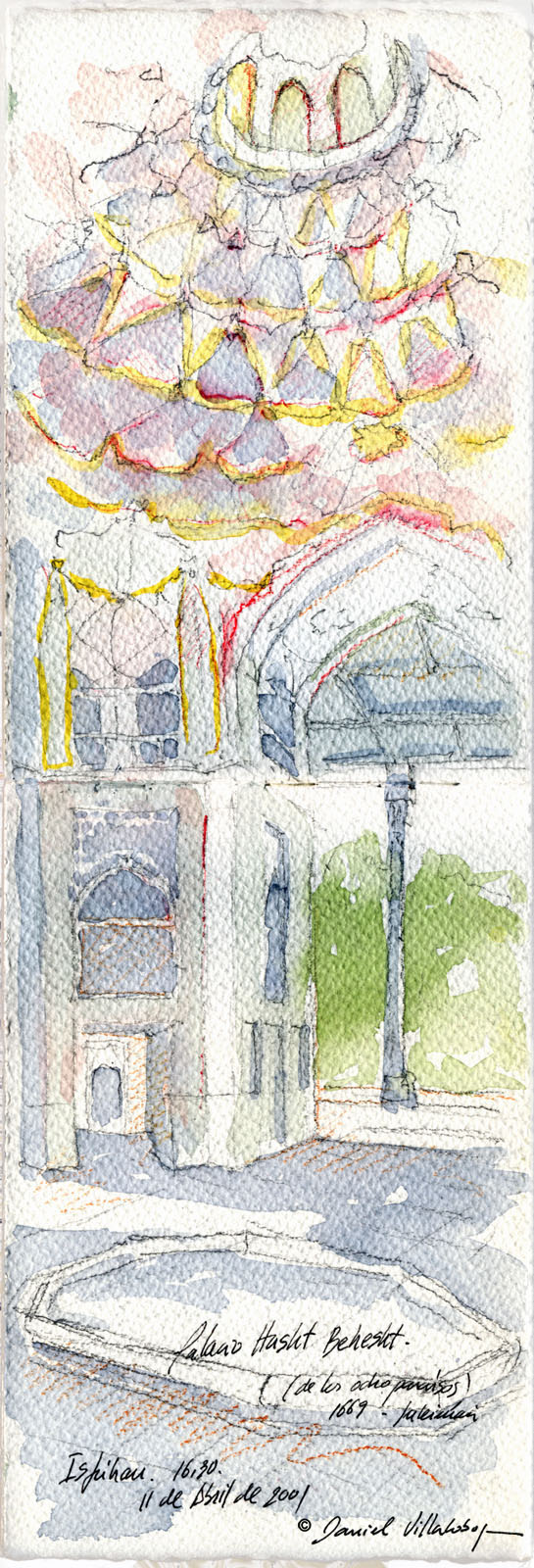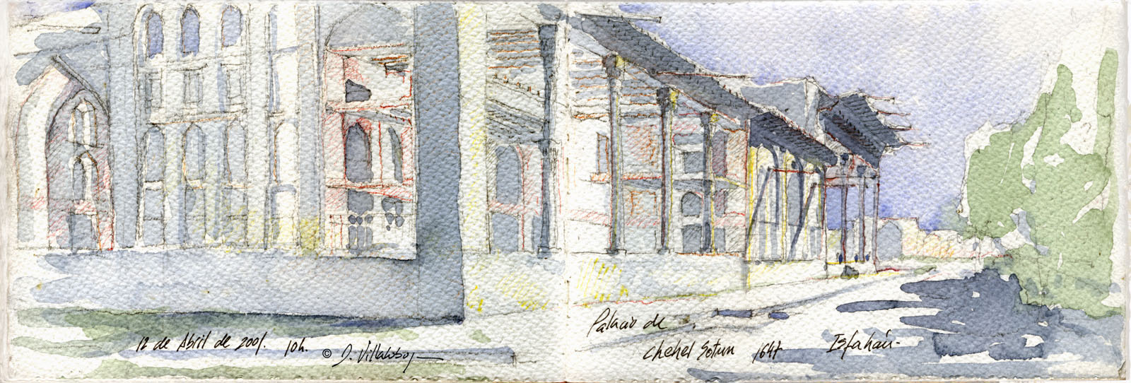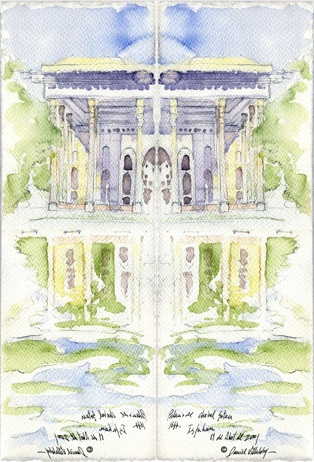 IRÁNPALACIO DE CHEHEL SOTÚN "DE LAS CUARENTA COLUMNAS". ISFAHÁN, IRÁN. (MIDDLE EAST). [Descripción: “Palacio de Chehel Sotún. 1647. Isfahán. 11-Abril-2001.” Lápices de colores y acuarela [50,5 x 17,5 cts.] (Dibujo realizado para ser contemplado junto a su reflejo en un espejo). © Daniel Villalobos Alonso]