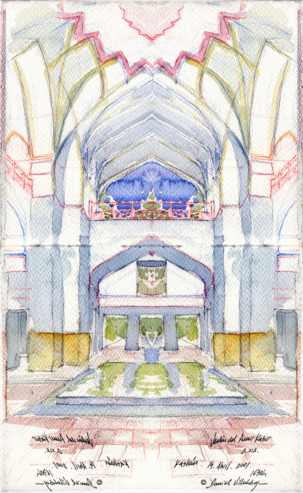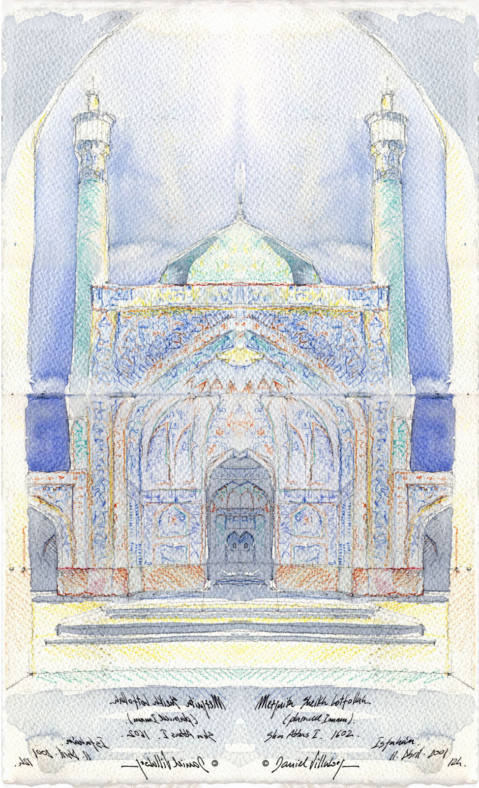 IRÁNMEZQUITA DEL JEQUE LOTF ALLAH (s. XVII). ISFAHÁN, IRÁN. (MIDDLE EAST). [Descripción: “Mezquita Sheikh Lotfollah. Sha Abbas I. 1602. Isfahán. 11-Abril-2001. 12 h.” Lápices de colores y acuarela [50,5 x 17,5 cts.] (Dibujo realizado para ser contemplado junto a su reflejo en un espejo). © Daniel Villalobos Alonso]