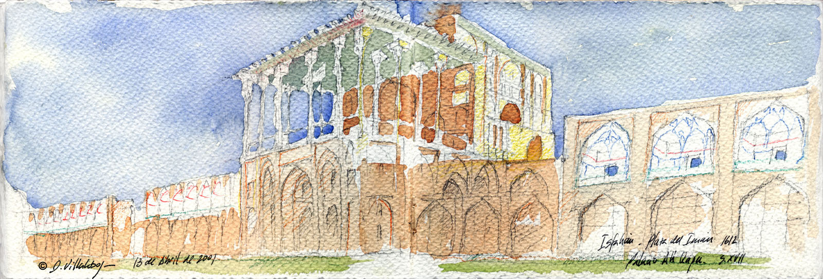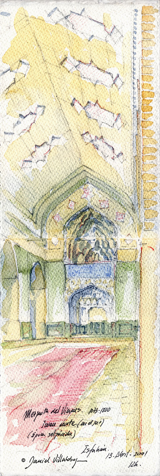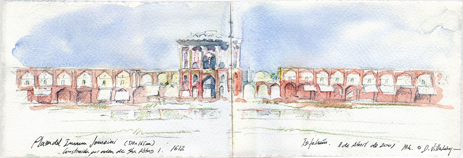 IRÁNPLAZA DE NAGHSH-I JAHAN, “PLAZA REAL” O “PLAZA DEL IMÁN JOMEINI” (S. XVII). ISFAHÁN, IRÁN. (MIDDLE EAST). [Descripción: “Plaza del Imam Jomeini. (510 x 165 m). Construida por orden de Sha Abbas I. 1612. Isfahán. 11 de Abril de 2001. 13 h.” Lápices de colores y acuarela [17,5 x 50,5 cts.]. © Daniel Villalobos Alonso]