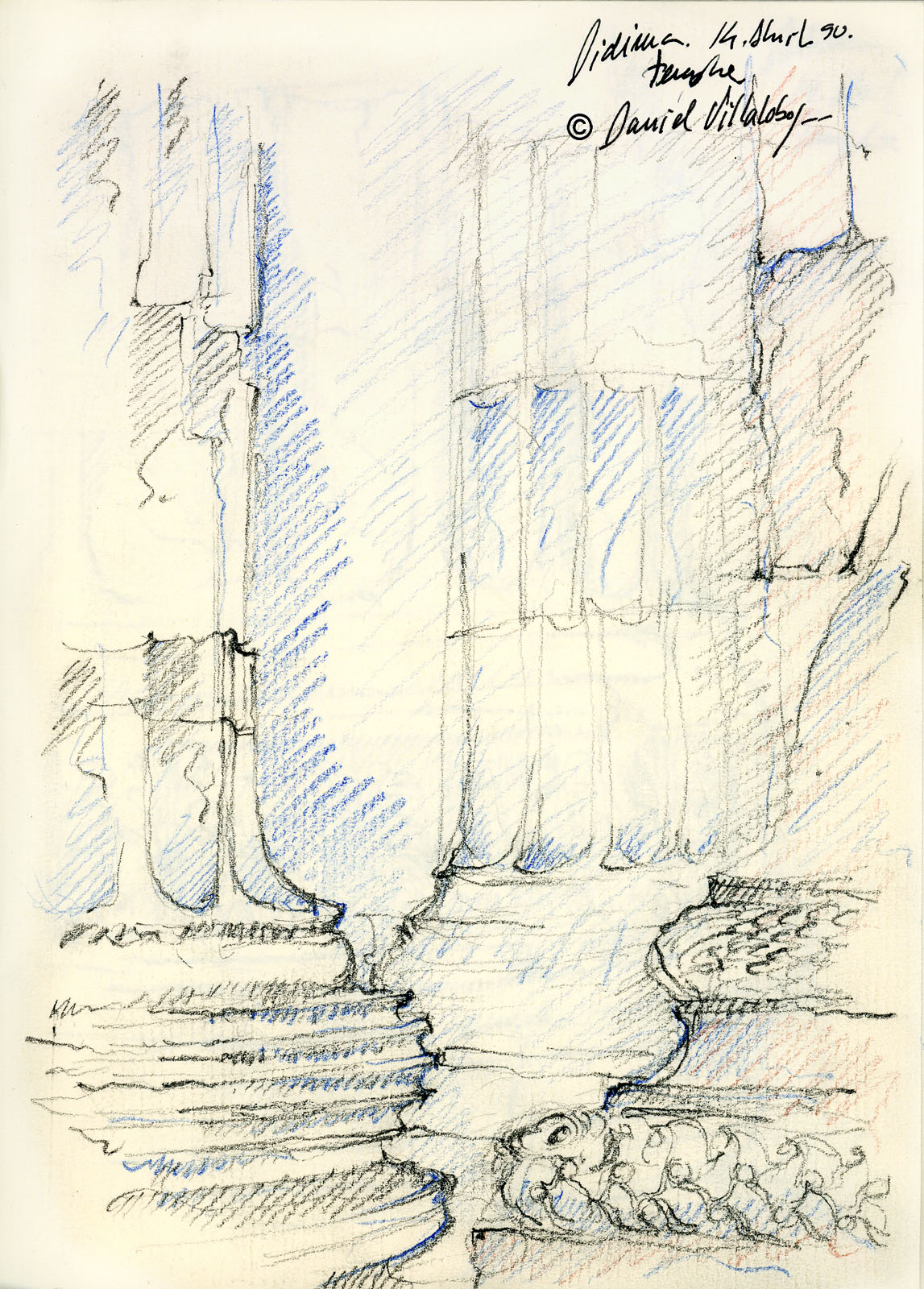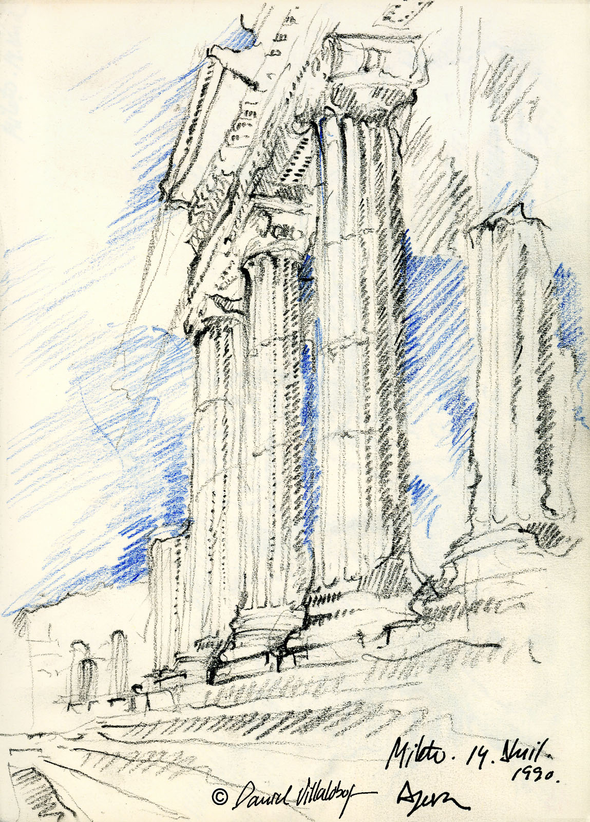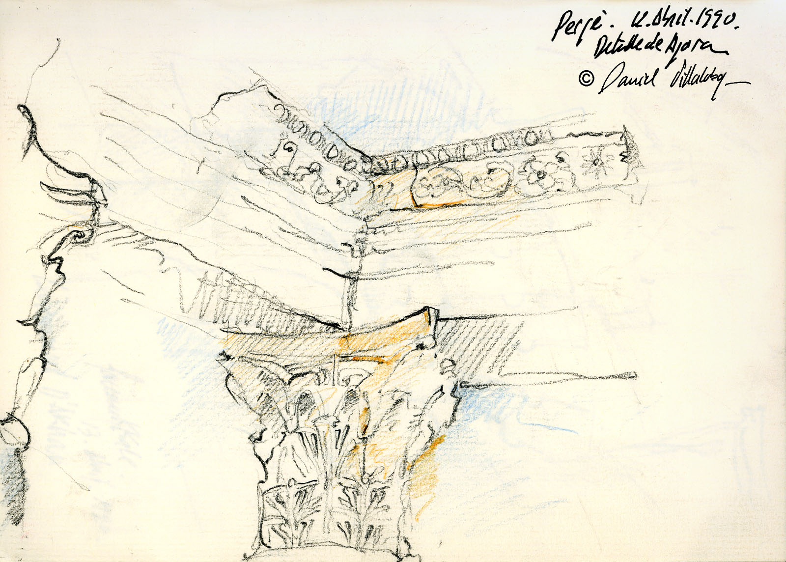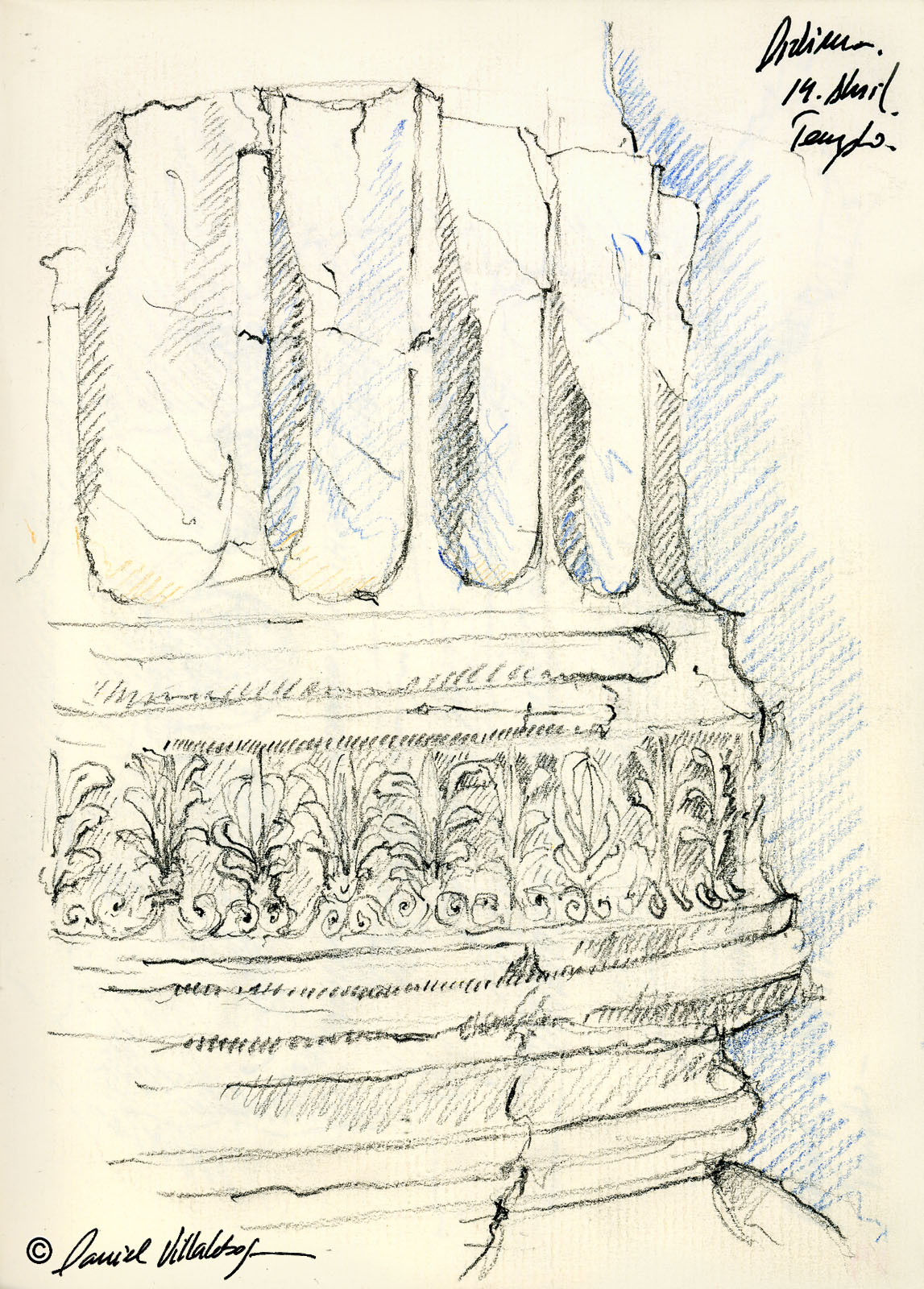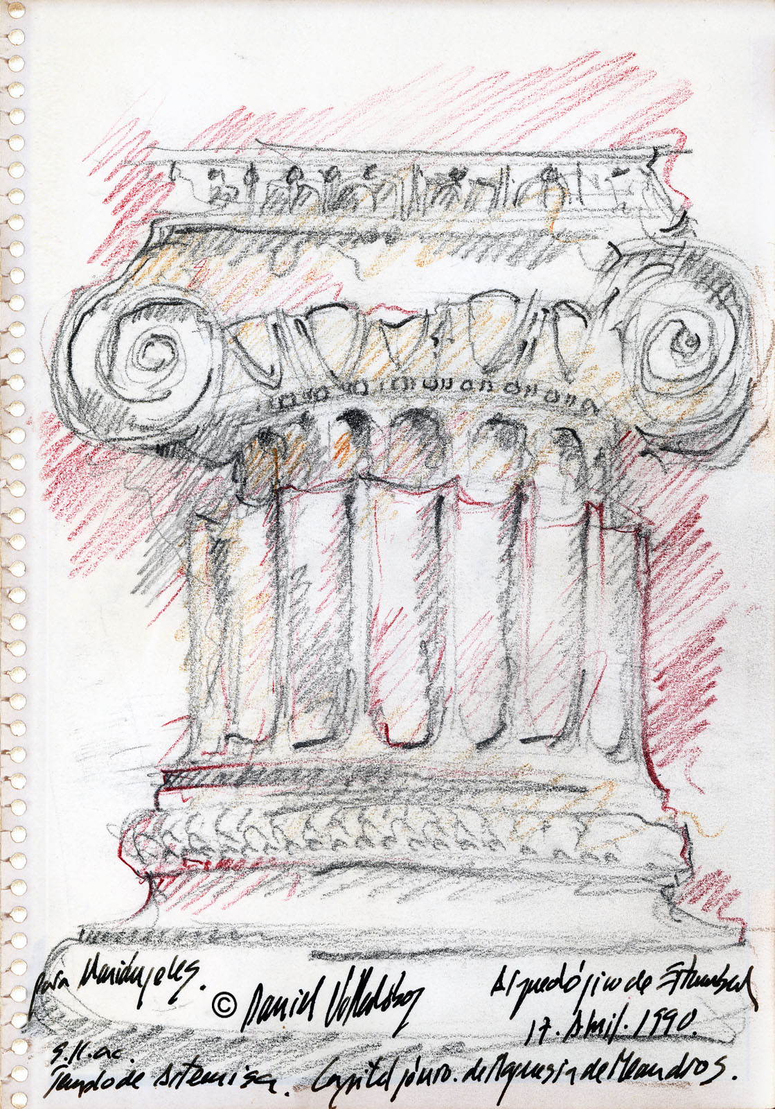 TURQUÍACAPITEL JÓNICO. TEMPLO DE ARTEMISA (S. II A.C.). MAGNESIA DE MEANDROS. MUSEO ARQUEOLÓGICO DE ESTAMBUL (TURKEY). [Descripción: “Templo de Artemisa. s. II. ac. Capitel jónico de Magnesia de Meandros. Arqueológico de Estambul. 17-Abril-1990. Para Mariángeles.” Lápices de colores [21 x 14,5 cts.]. © Daniel Villalobos Alonso]