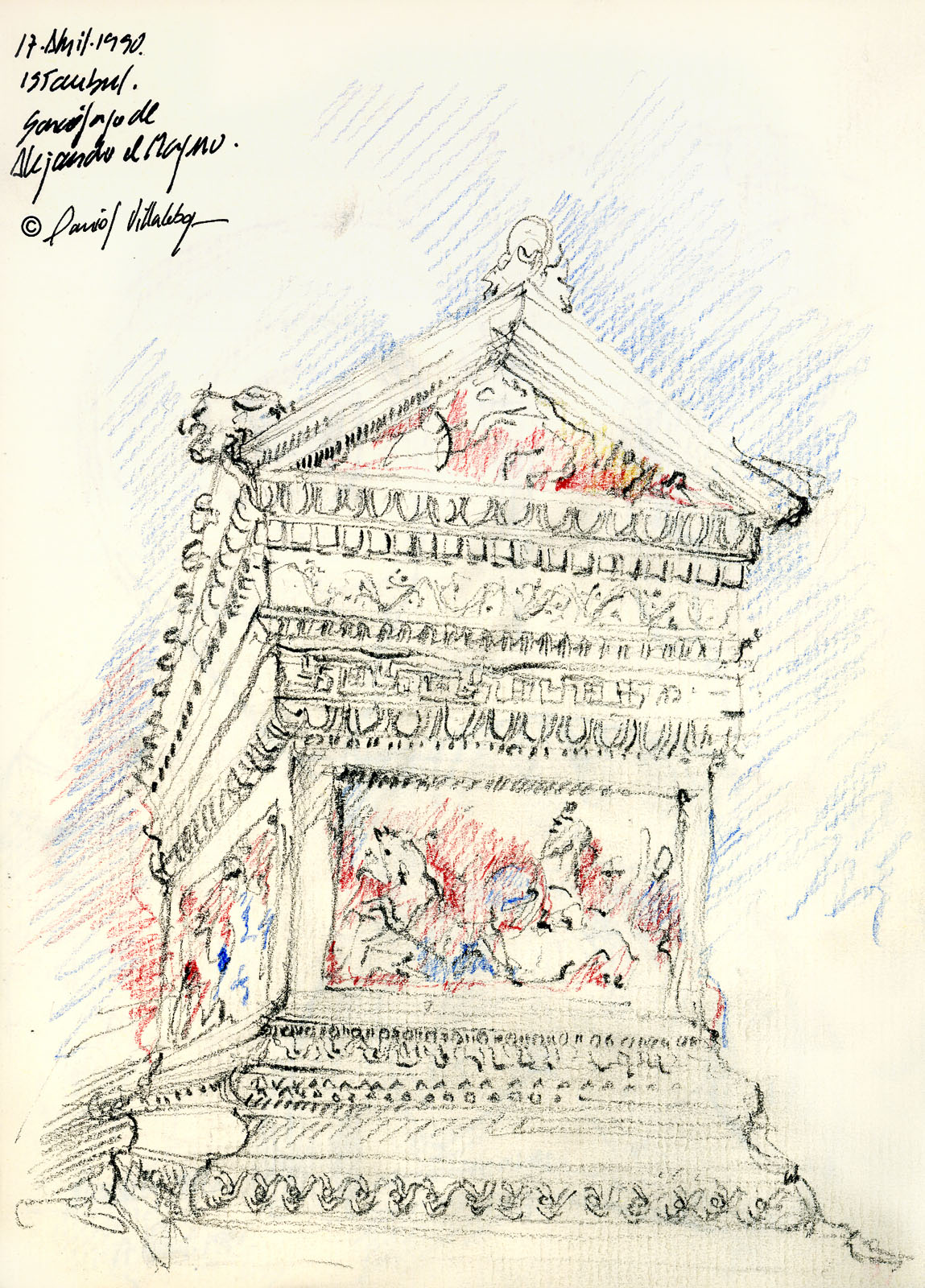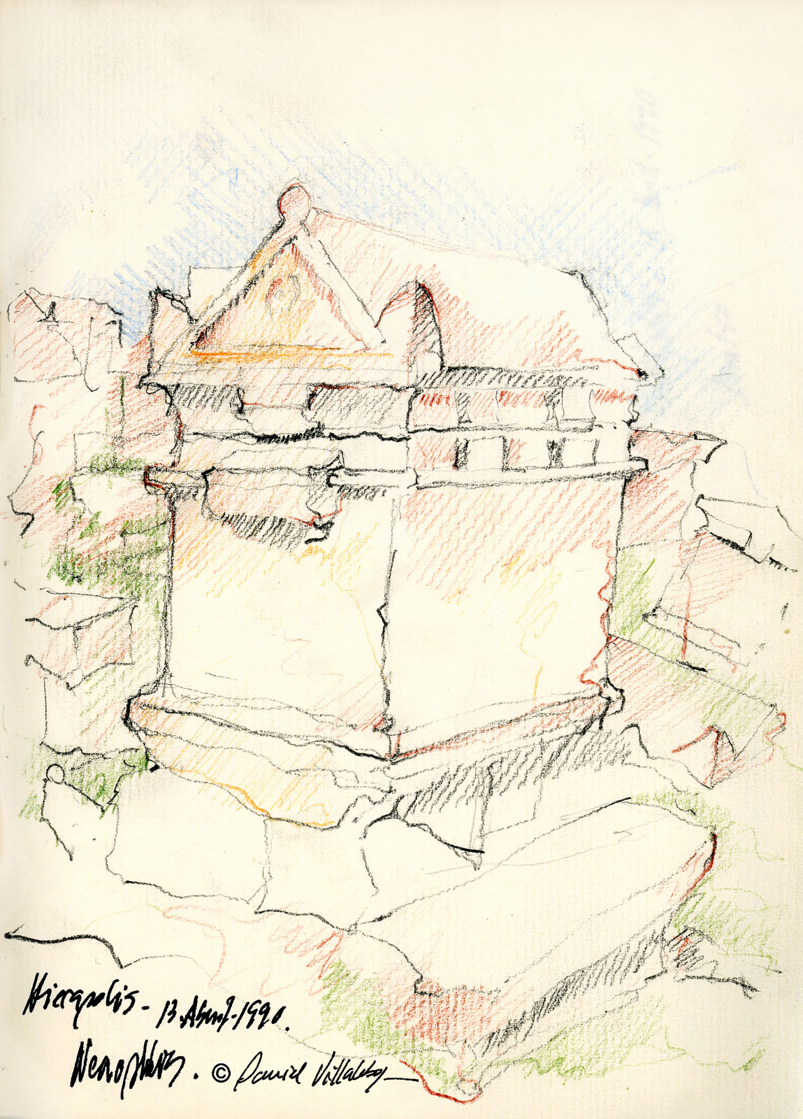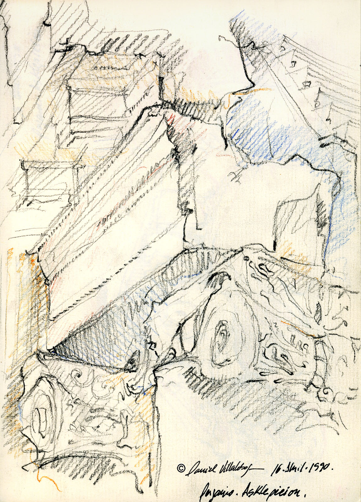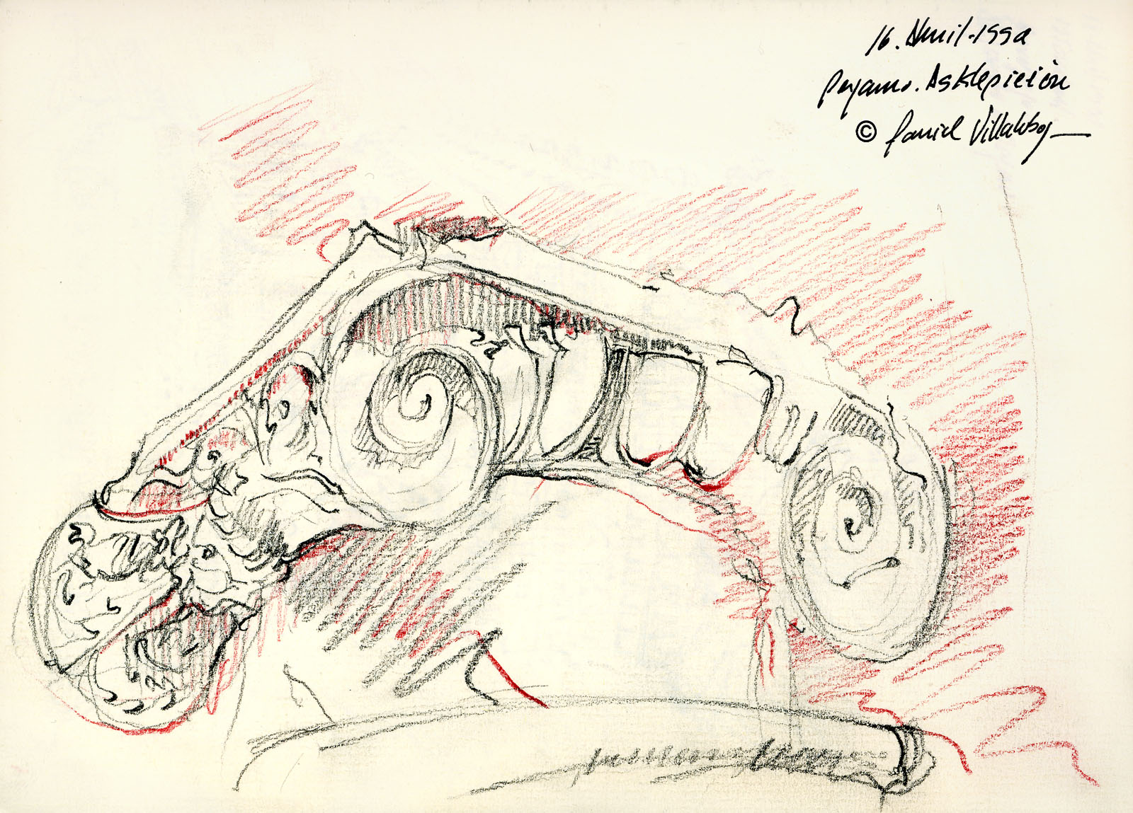 TURQUÍACAPITEL JÓNICO. TEMPLO DE ARTEMISA (S. II A.C.). MAGNESIA DE MEANDROS. MUSEO ARQUEOLÓGICO DE ESTAMBUL (TURKEY). [Descripción: “Templo de Artemisa. s. II. ac. Capitel jónico de Magnesia de Meandros. Arqueológico de Estambul. 17-Abril-1990. Para Mariángeles.” Lápices de colores [21 x 14,5 cts.]. © Daniel Villalobos Alonso]