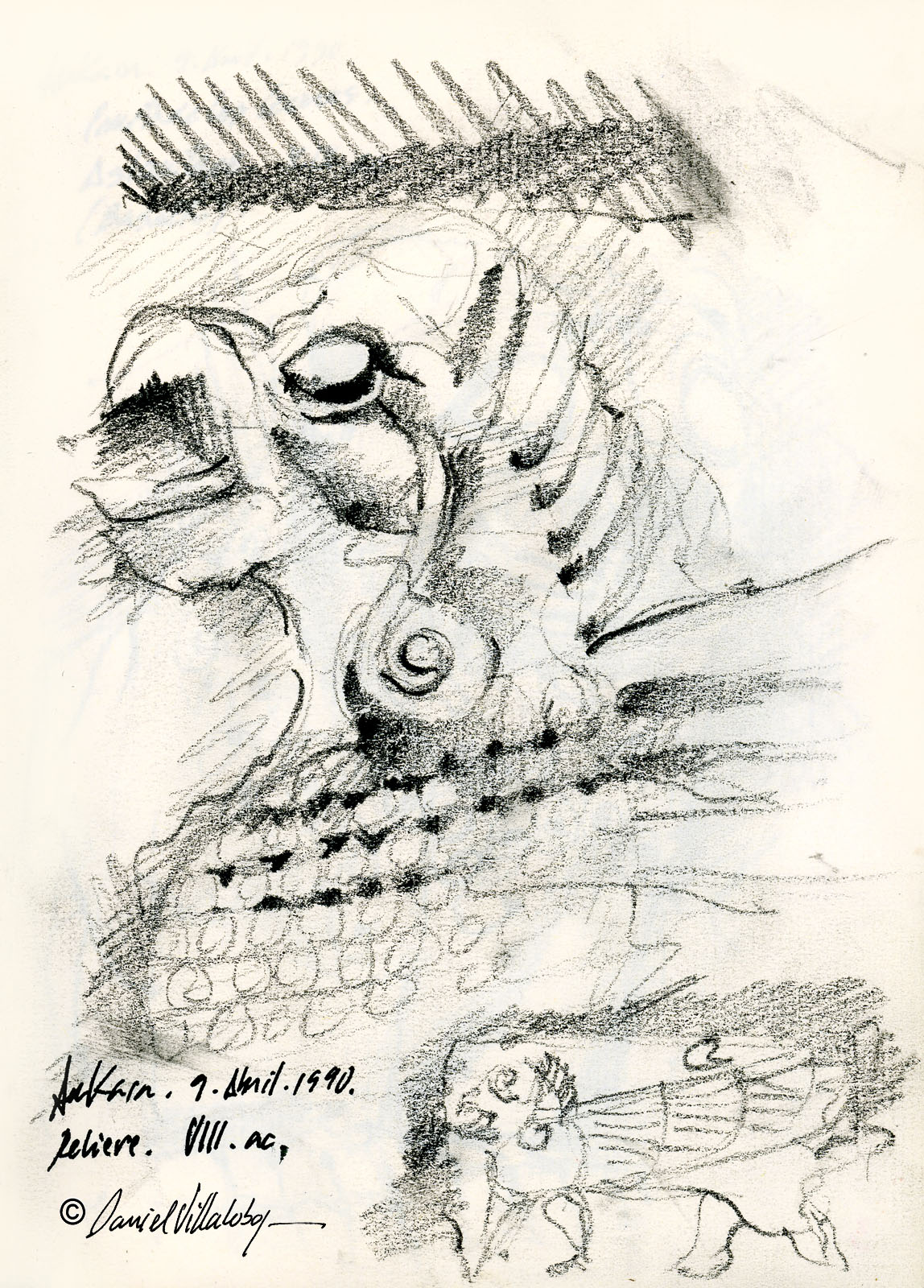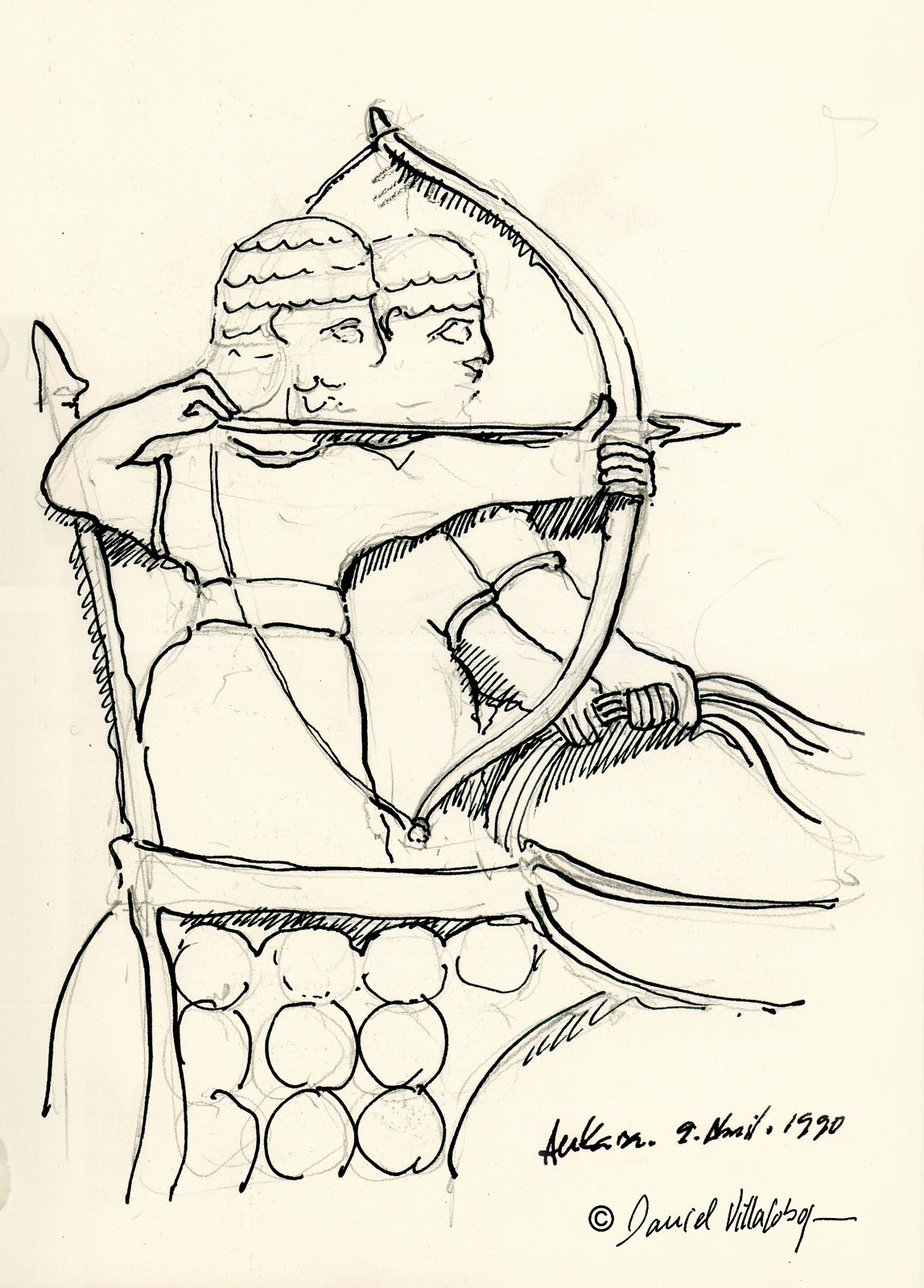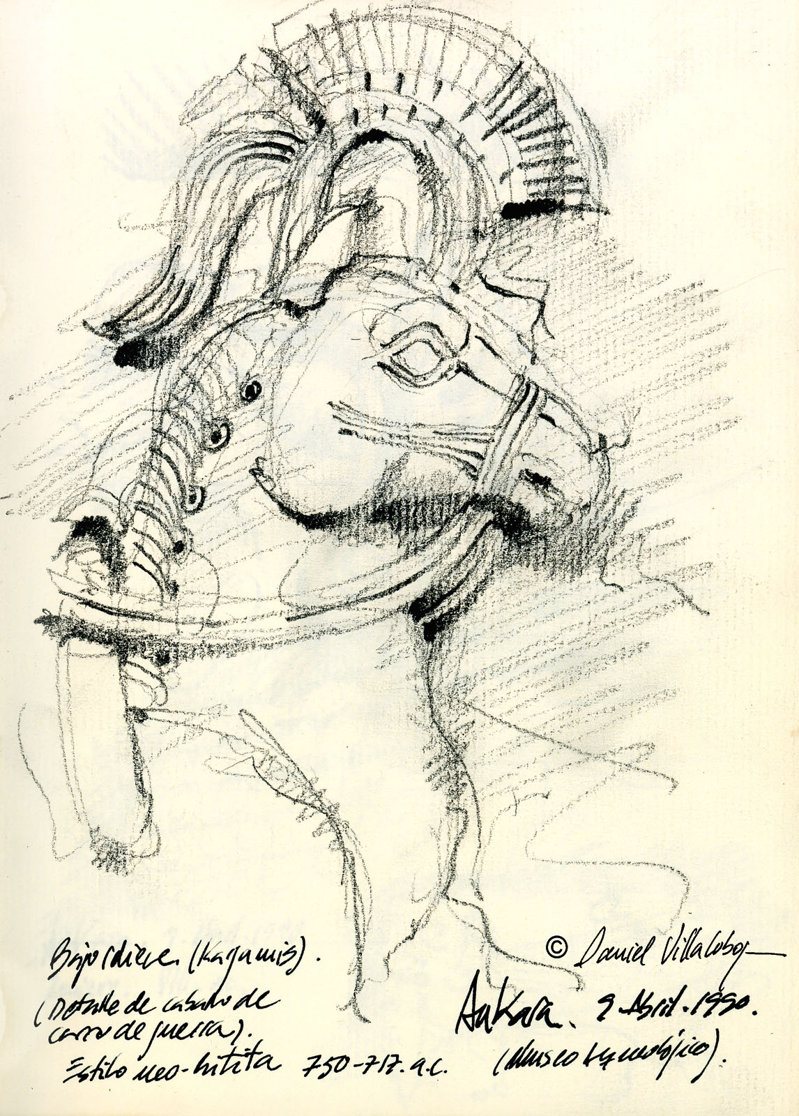 TURQUÍA BAJORRELIEVE. DETALLE DE CARRO DE GUERRA. MUSEO DE LAS CIVILIZACIONES DE ANATOLIA. ANKARA (TURKEY). [Descripción: “Bajo relieve (kajamis)(Detalle de caballo de guerra). Estilo neo-hitita, 750-717. A.C. Ankara (Museo Arqueológico). 9-Abril-1990.” Dibujo a lápiz [20,5 x 15 cts.]. © Daniel Villalobos Alonso]